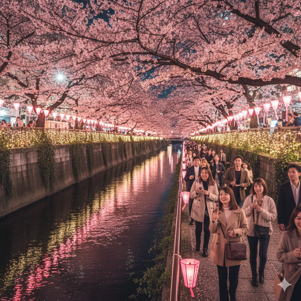 약 4km에 달하는 강변을 따라 800그루의 벚꽃 나무가 터널을 이룹니다. 밤에는 조명이 켜지는 라이트업이 장관이며, 강변 카페에서 즐기는 핑크 샴페인은 도쿄 벚꽃 여행의 상징입니다.